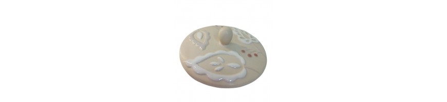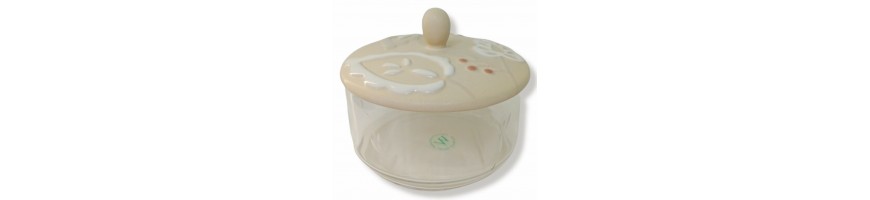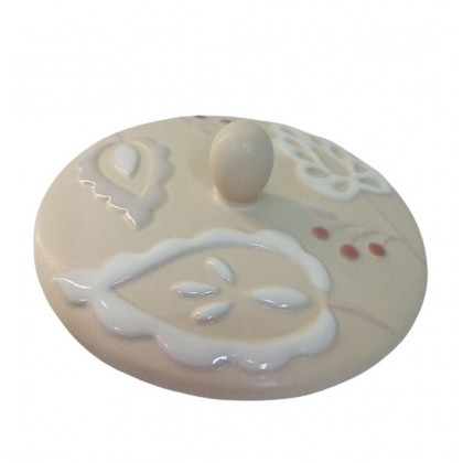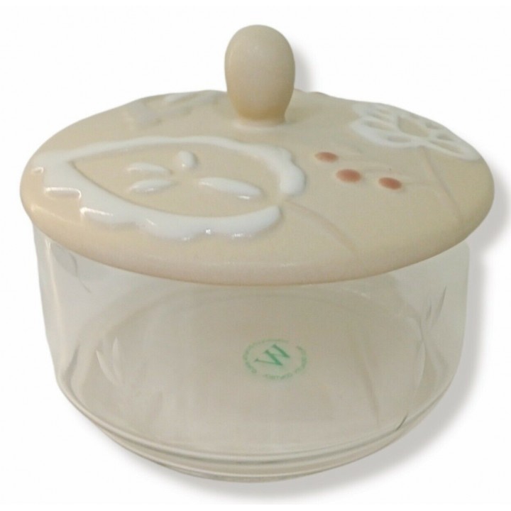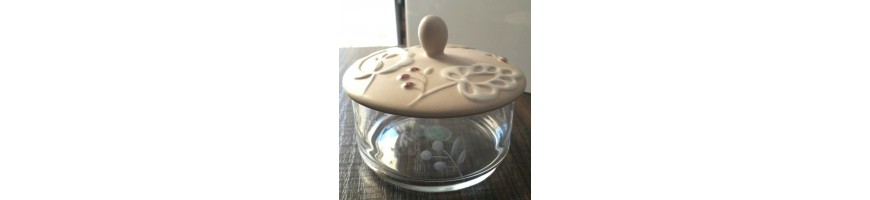 Barattolo in vetro con decoro pantografato, tappo in gres porcellanato con decoro in rilievo