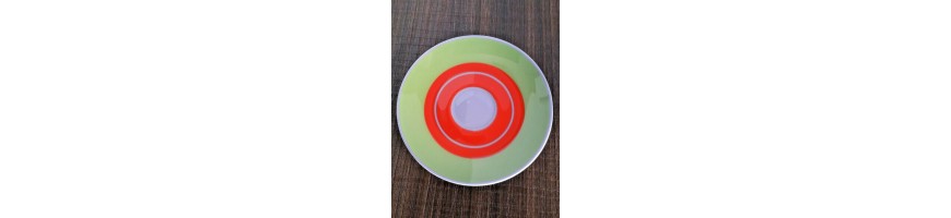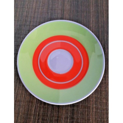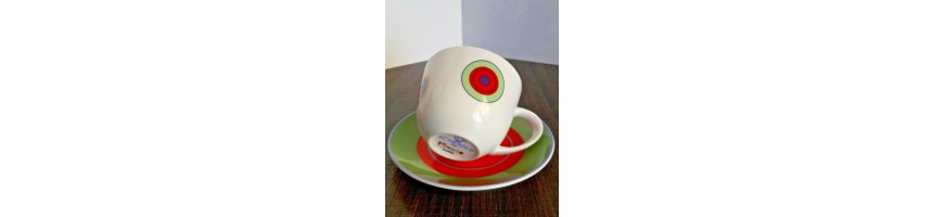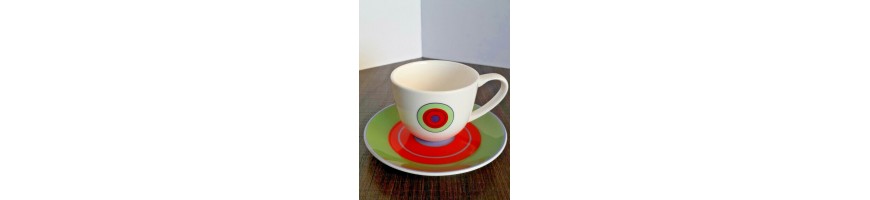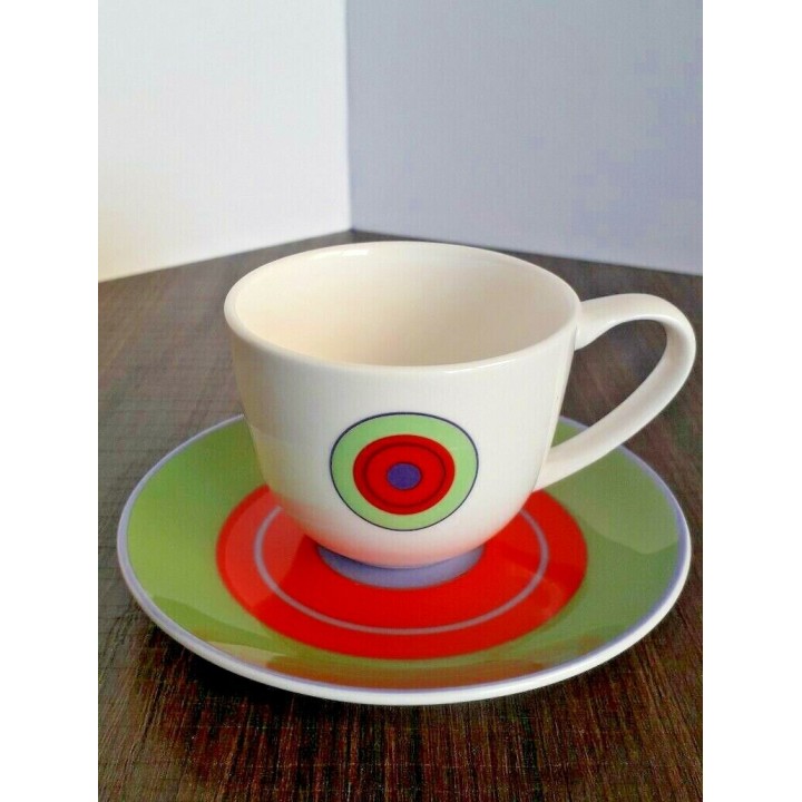 Le tazzine in fine porcellana bianca con decoro a cerchi colorati sono complete di piattino tutto colorato. Materiale principale : Fine Porcellana Bone China marca Scherzer, modello Fiesta, colore Merengue adatto per lavastoviglie e Microonde