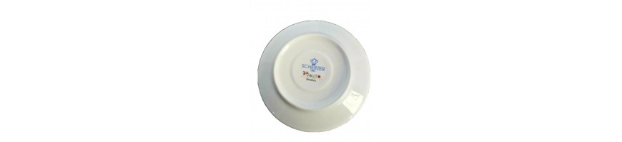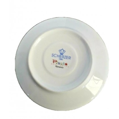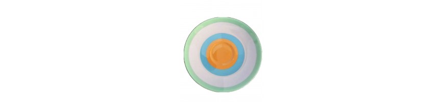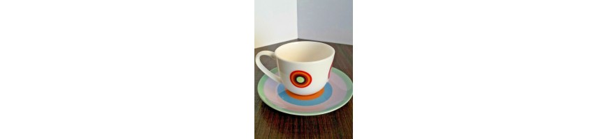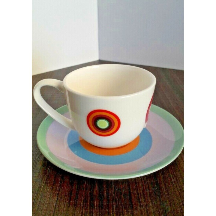 Le tazzine in fine porcellana bianca con decoro a cerchi colorati sono complete di piattino tutto colorato. Materiale principale : Fine Porcellana Bone China marca Scherzer, modello Fiesta, colore Merengue adatto per lavastoviglie e Microonde