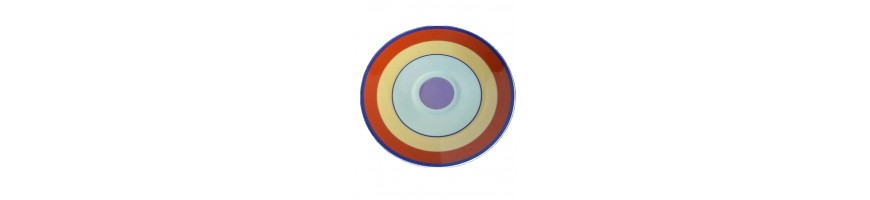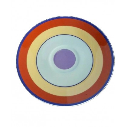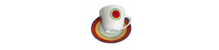 Le tazzine in fine porcellana bianca con decoro a cerchi colorati sono complete di piattino tutto colorato. Materiale principale : Fine Porcellana Bone China marca Scherzer, modello Fiesta, colore Samba adatto per lavastoviglie e Micro-onde