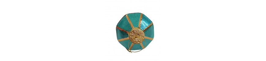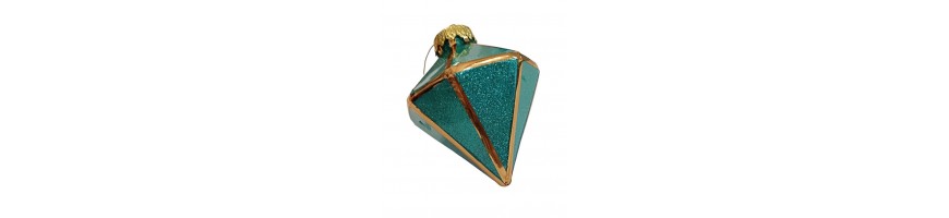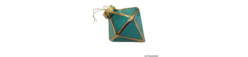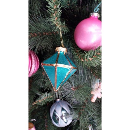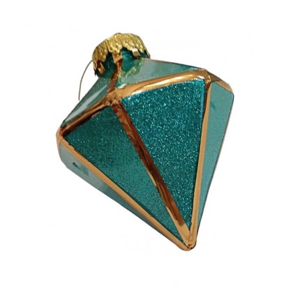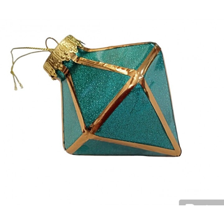 Decorazione natalizio forma sfaccettata come diamanti colore verde brillante con profili colore oro, capsula per appendere in metallo colore oro con filino pronte per decorare il vostro albero di natale