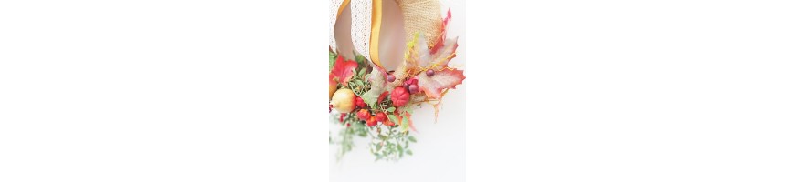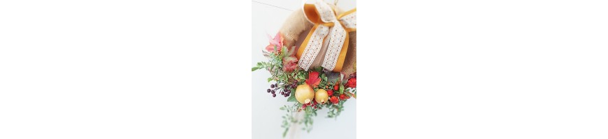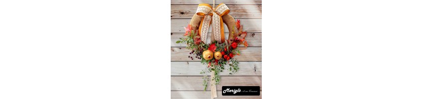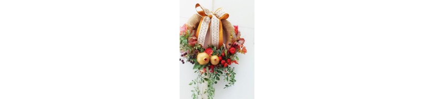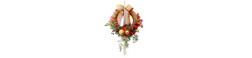 Il Dietroporta con tema autunnale è stato realizzato nel nostro laboratorio con fiori e frutta sintetici come: melograni, piccole zucche, mirtilli e foglie di vite. La base della coroncina è realizzata in paglia naturale intrecciata arricchita con juta e fiocco in cotone