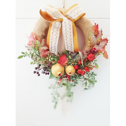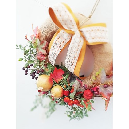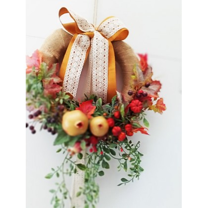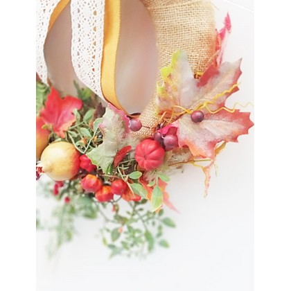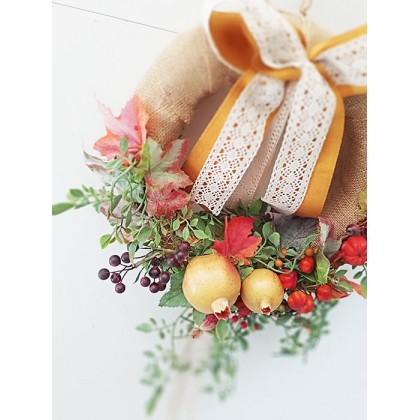Coroncina dietroporta autunnale tondo con frutta e fiori artificiali. Prodotto artigianaleÂ