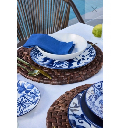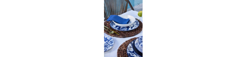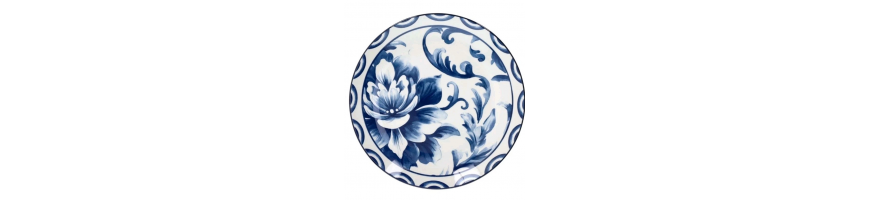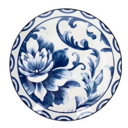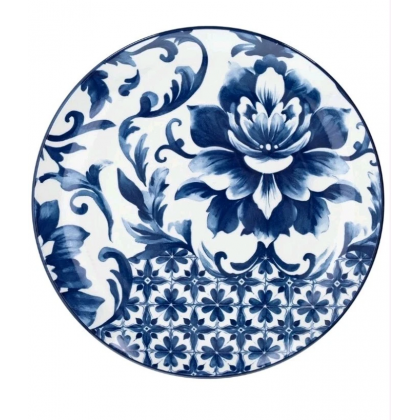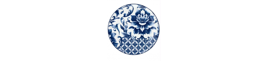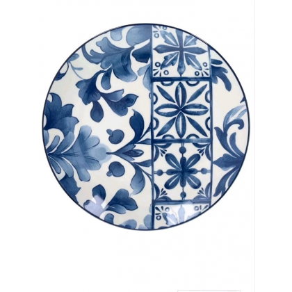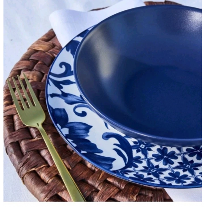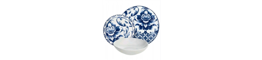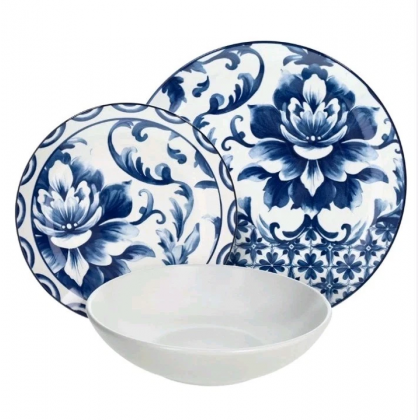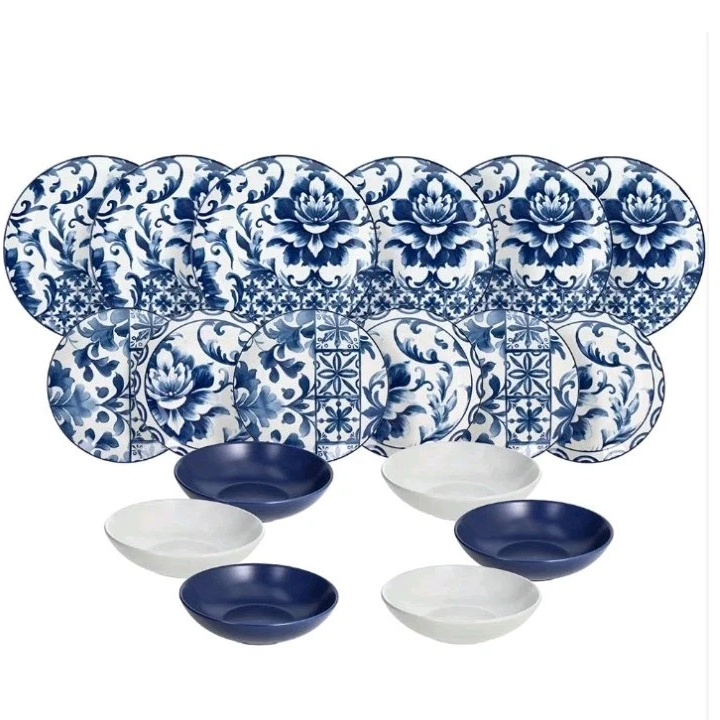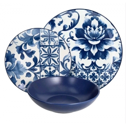 Il set è composto da 6 piatti piani decoro floreale blu, 3 piatti fondi colore bianco, 3 piatti fondi colore blu, 6 piatti dessert con decoro.