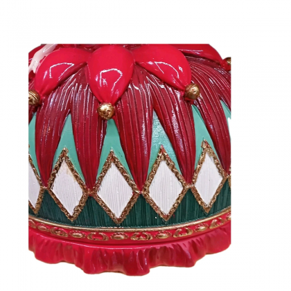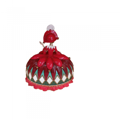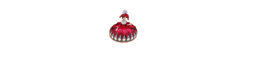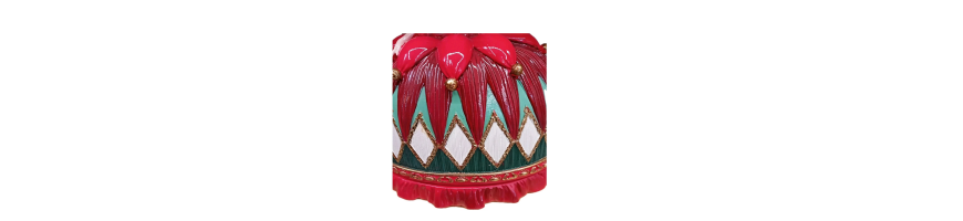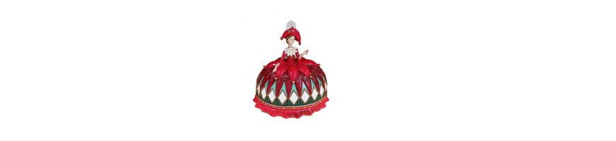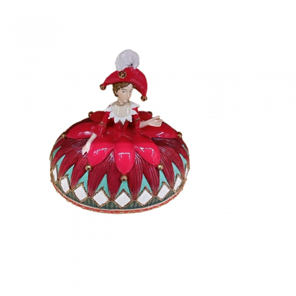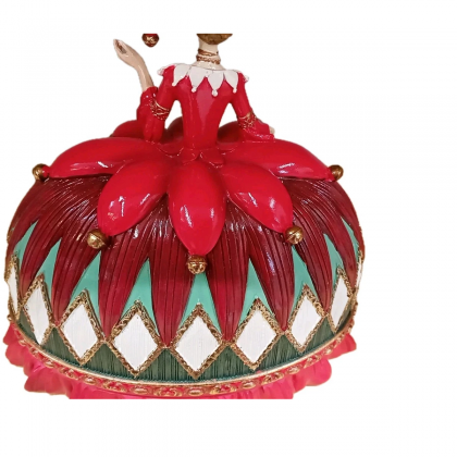 Questa figura femminile in abiti colorati, con gonna a diamante e colori vivaci, incarna lo spirito giocoso e raffinato delle feste.