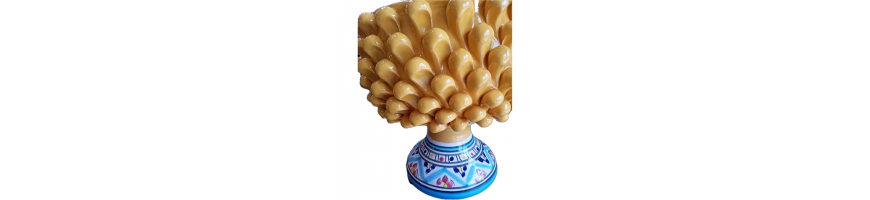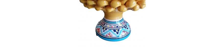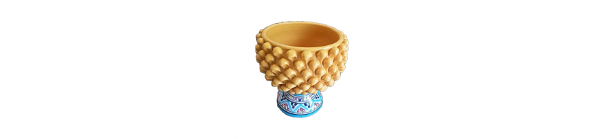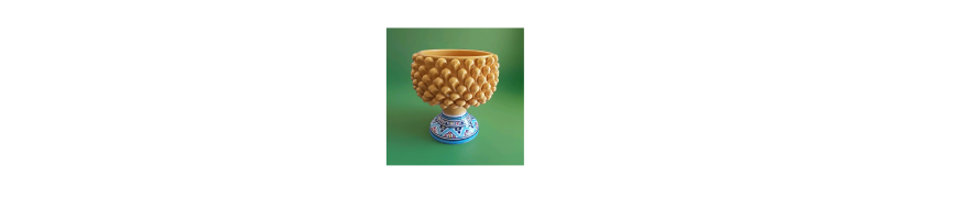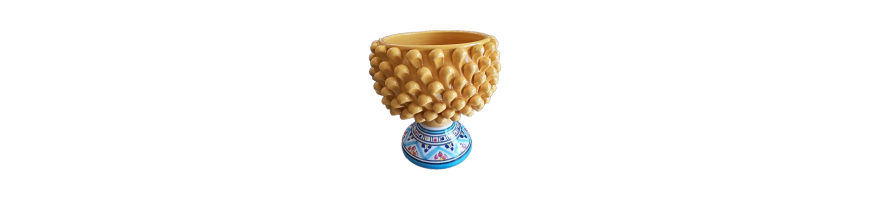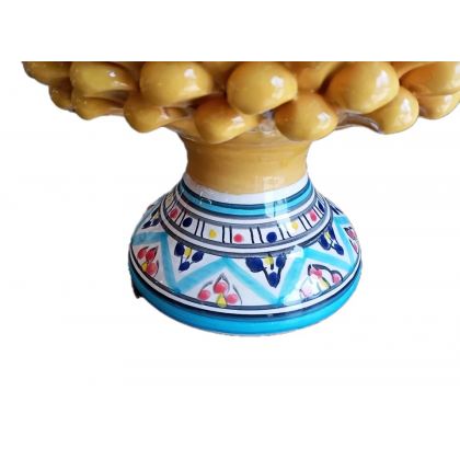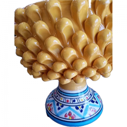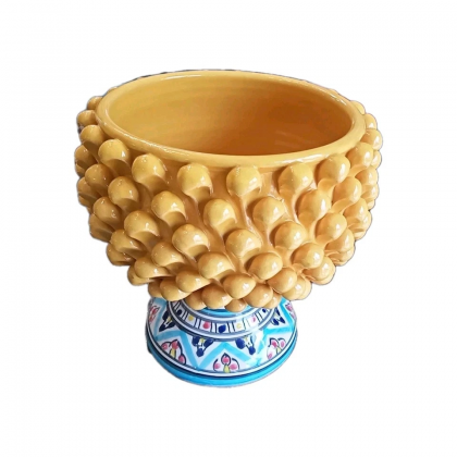 Vaso porta-piante realizzato a mano in ceramica forma pigna colore giallo con piede decorato fantasia colorato.