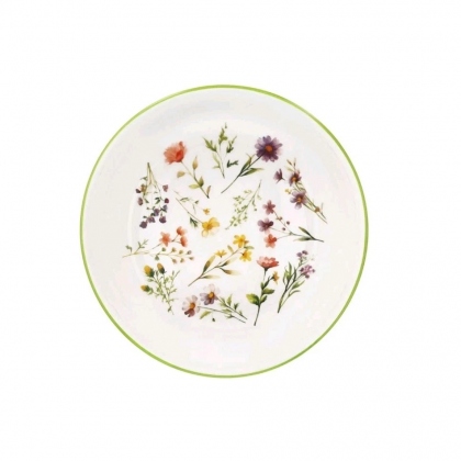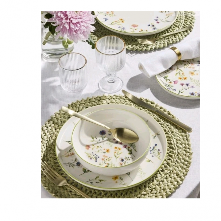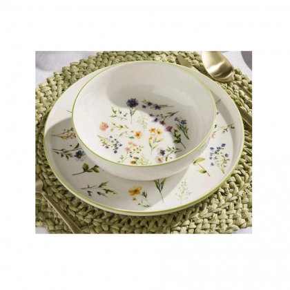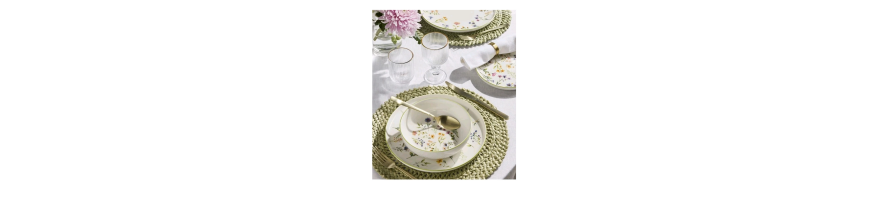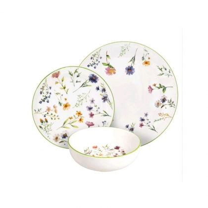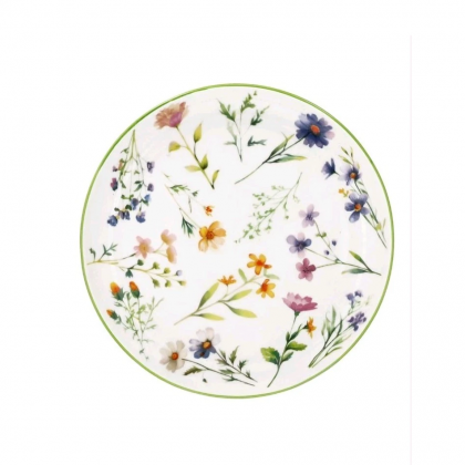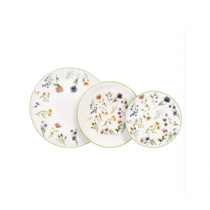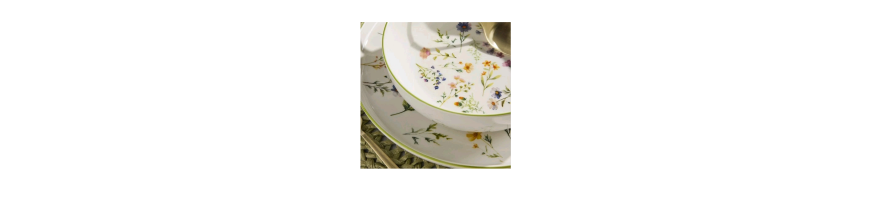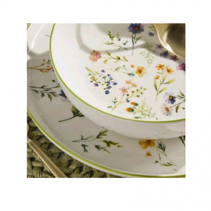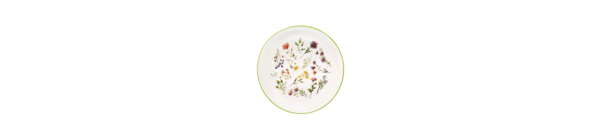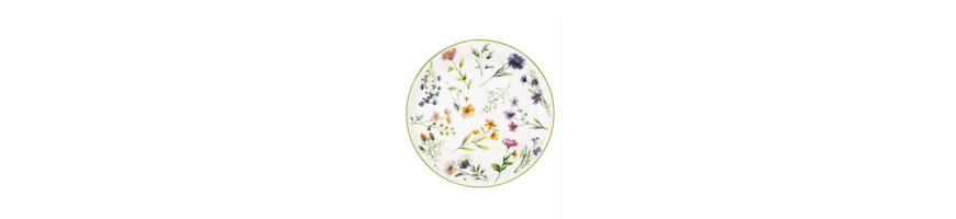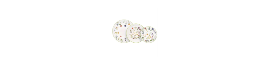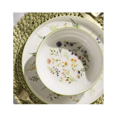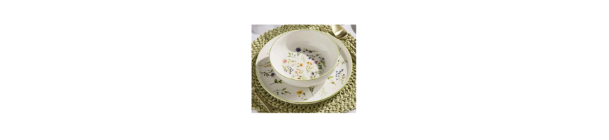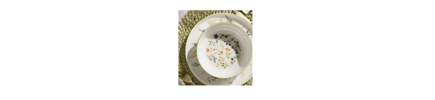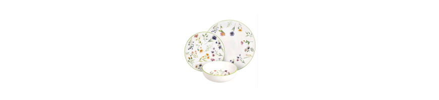 Stoviglie in fine porcellana bianca motivo floreale multicolore dalla forma moderna ed elegante, perfetto per una mise in en place raffinata per tutte le occasioni.
