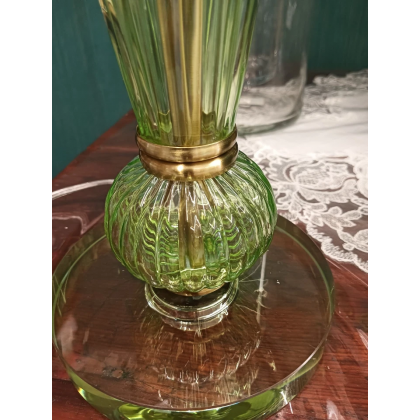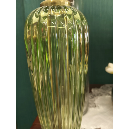 Lampada dal look moderno e raffinato con base in vetro colore verde rigato con giunture in metallo colore oro satinato;