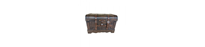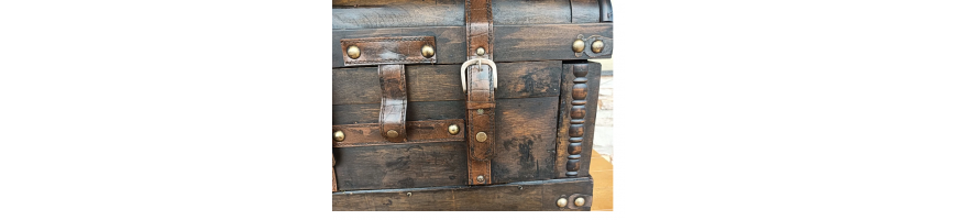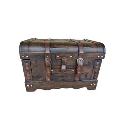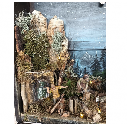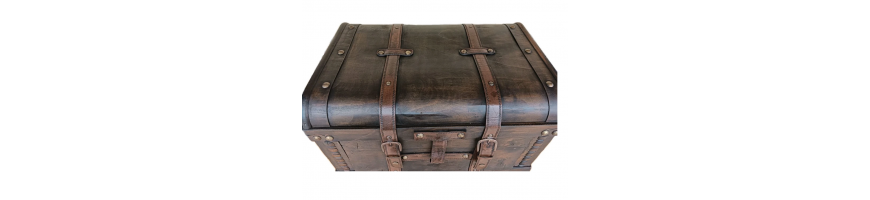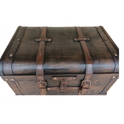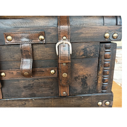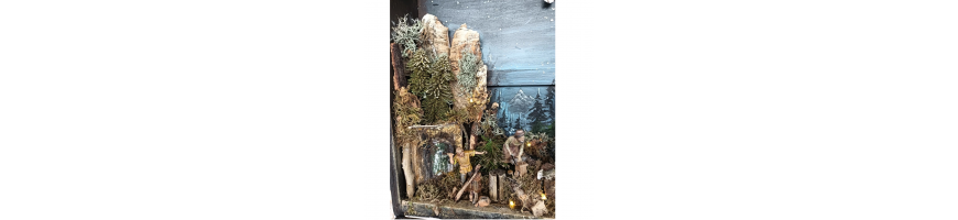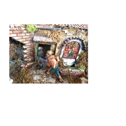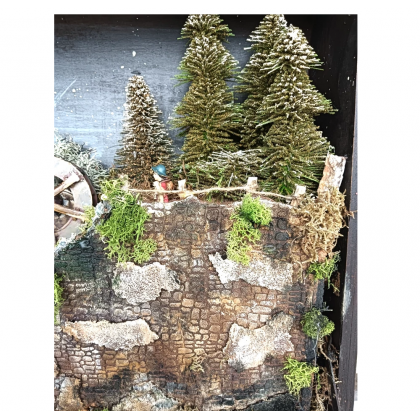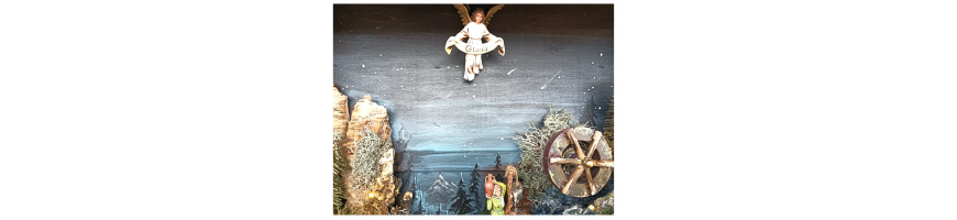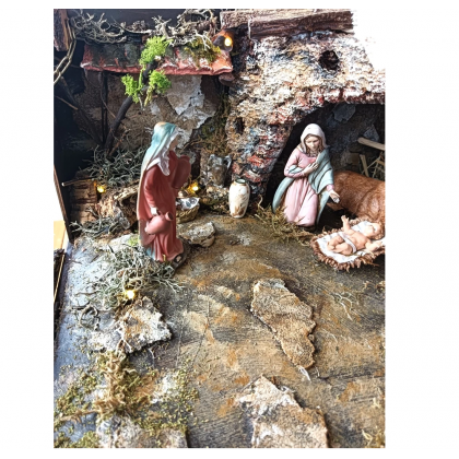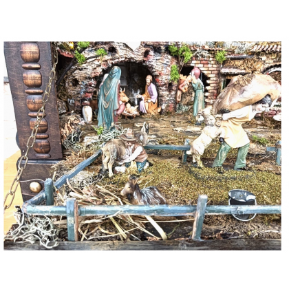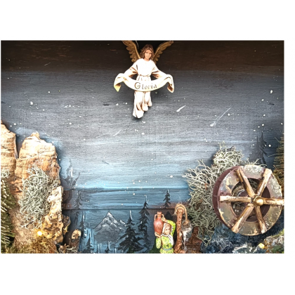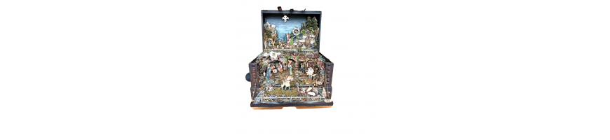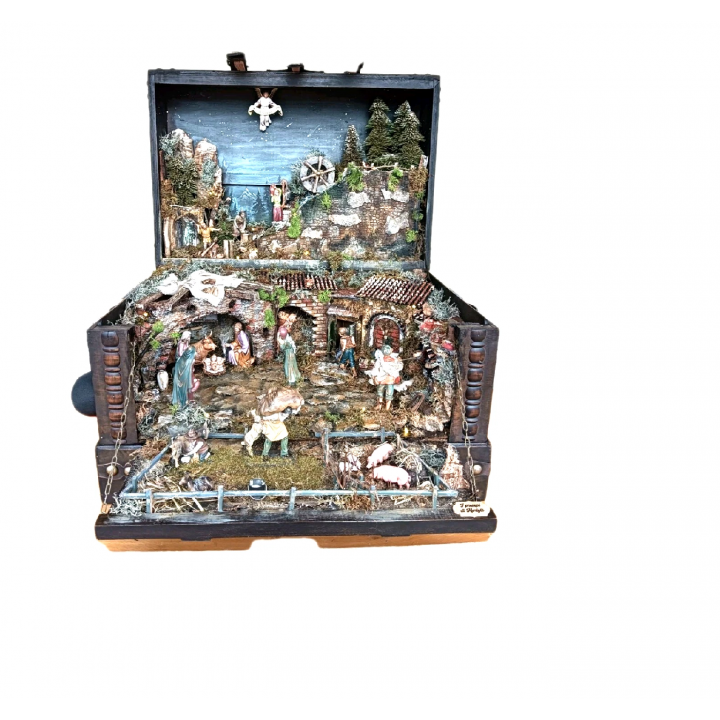 Il Presepe è stato realizzato in un vecchio Baule di legno con cinturini e manici in pelle restaurato con Natività con Angelo Moranduzzo Landi h 12 cm,