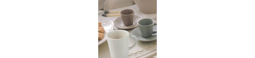 Tazza Mug 1 manico linea Retrò realizzata in ceramica forte (Kergrès) con decoro a rilievo sul manico colore Bianco con riflessi colore cielo.