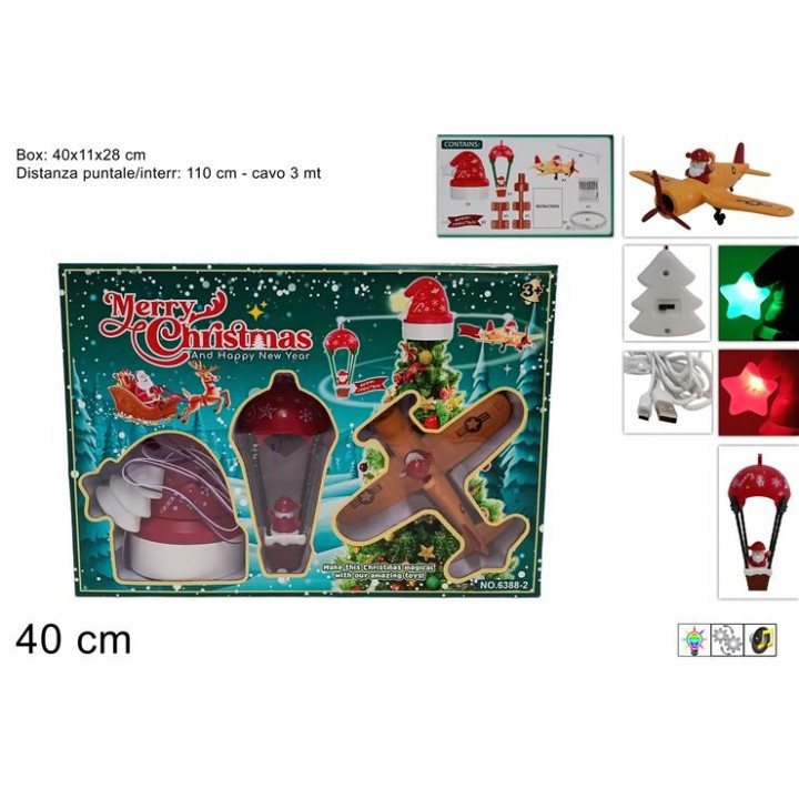 La Mongolfiera e l'aeroplano con babbo natale che girano intorno all'albero creano un affascinante spettacolo visivo che piacerà a grandi e piccini regalando un effetto magico accompagnato da musiche festose.
