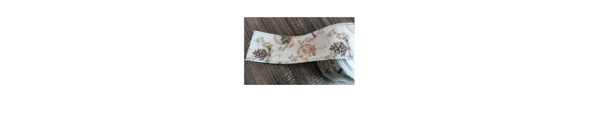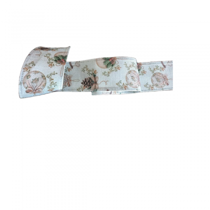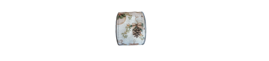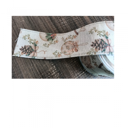 Nastro decorativo laminato colore ghiaccio con stampa natalizia beige, marrone, verde, con bordi,