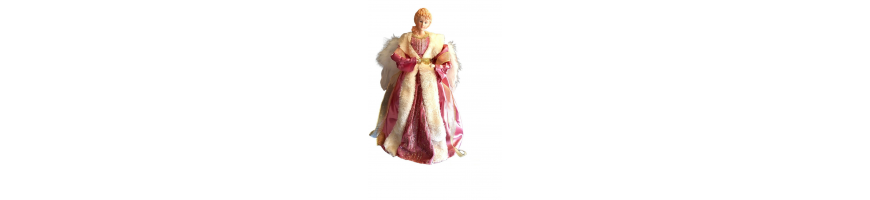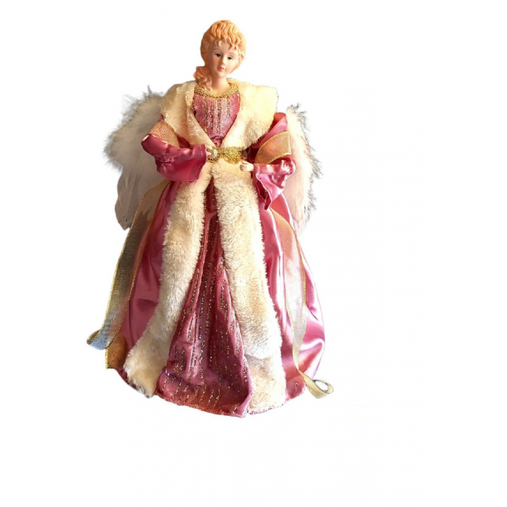 Angelo con vestito colore rosa antico in raso, parte centrale con fili d'oro, bordo con pelliccia, cinturino dorato; testa e mani in resina porcellanata, ali con piume bianche, corpo realizzato con cono in PVC; facilmente impilabile come Puntale per Albero di natale.