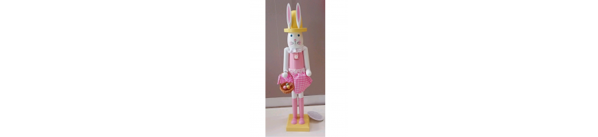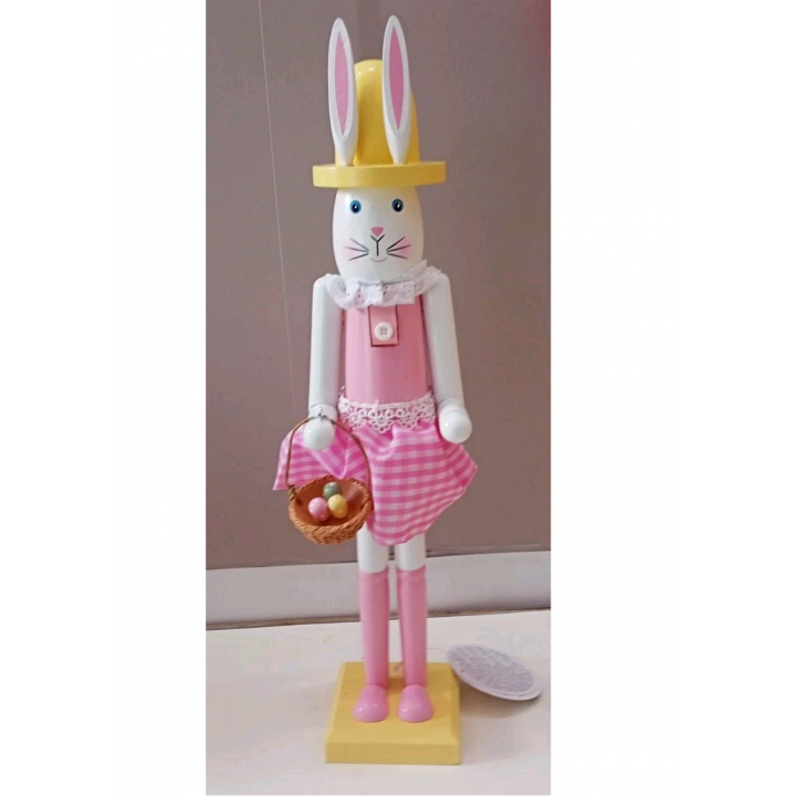 Simpatica decorazione pasquale questi schiaccianoci forma coniglio con vestitino in tessuto rosa e cestino