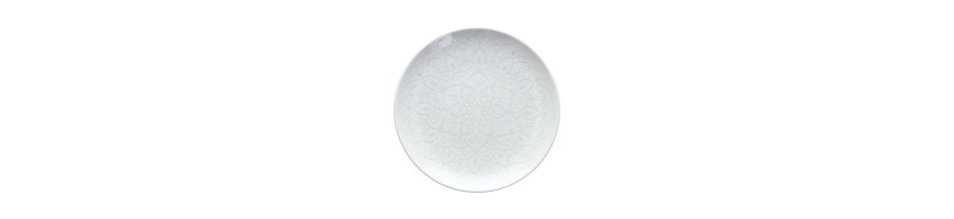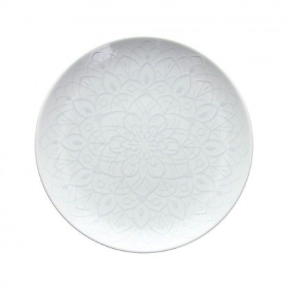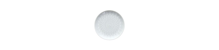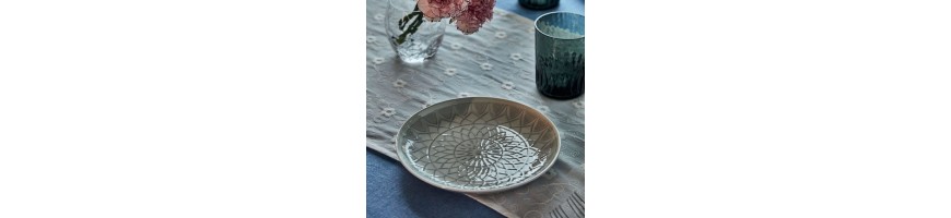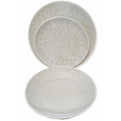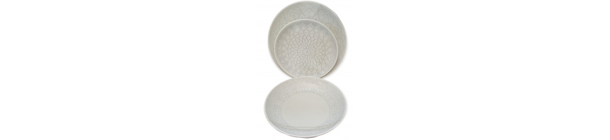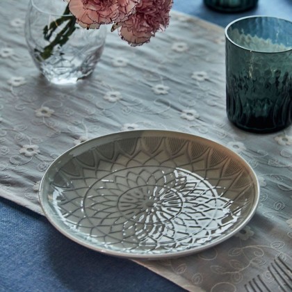 Il colore Grigio chiaro a contrasto con il decoro in rilievo esalta il disegno che riprende gli antichi decori delle maioliche italiane, lo stile dei piatti tipicamente mediterraneo è adatto sia ad una tavola informale che ad una mise en place raffinata