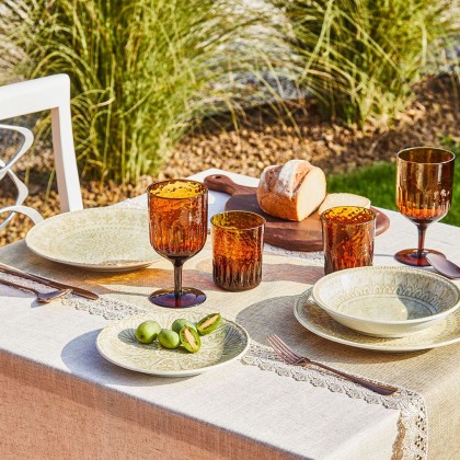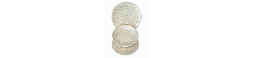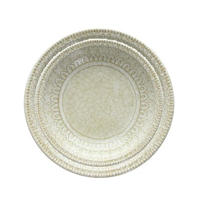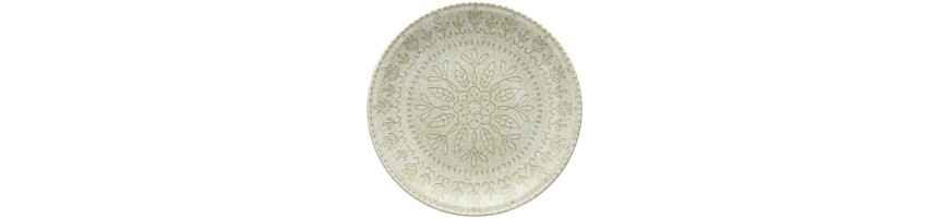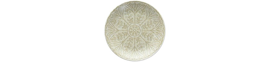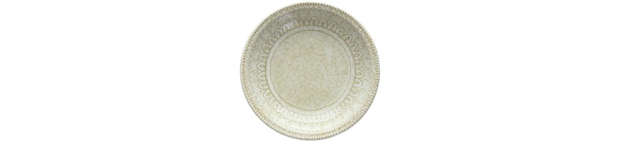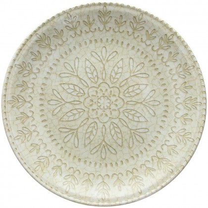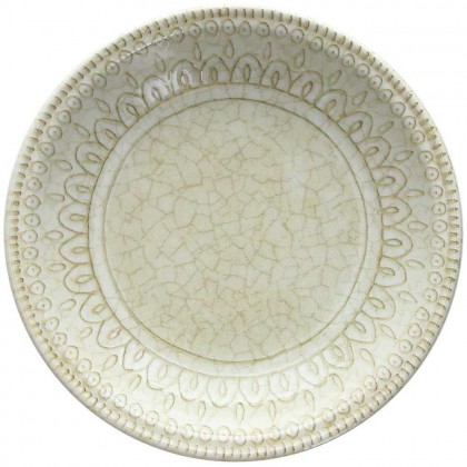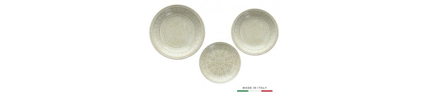Il colore Beige a contrasto con il decoro in rilievo effetto craquelè esalta il disegno che riprende gli antichi decori delle maioliche italiane, lo stile dei piatti tipicamente mediterraneo è adatto sia ad una tavola informale che ad una mise en place raffinata
