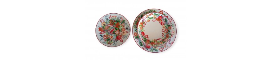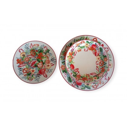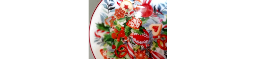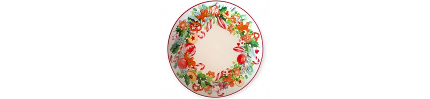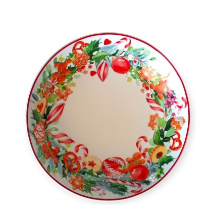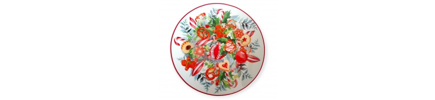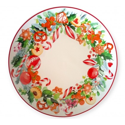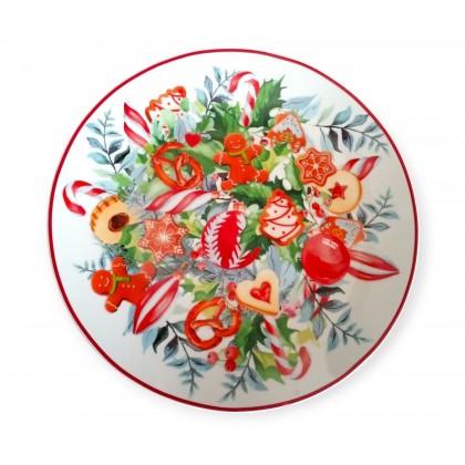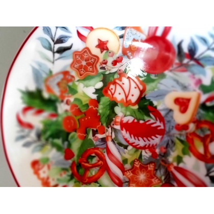 Realizzate in fine porcellana con un decoro dai disegni natalizi come pan di zenzero dolci e palline nei colori rosso e verde, perfetto per realizzare una tavola magica e fiabesca