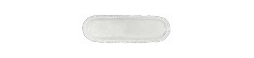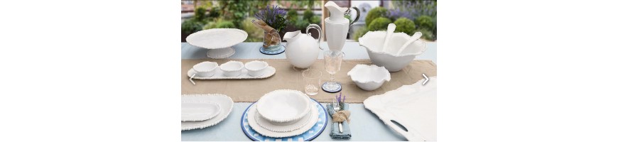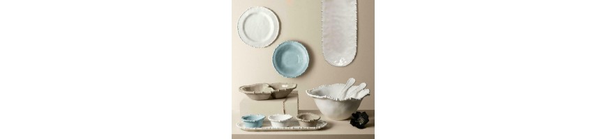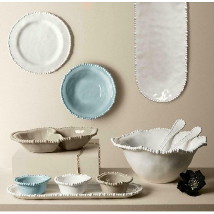 Articoli in melamina molto resistenti e pratici e al tempo stesso eleganti. Una linea per la tavola sobria che però non rinuncia all'originalità grazie agli inconfondibili bordi frastagliati contornati da file di di perle. I colori neutri permettono di essere facilmente combinati con altre linee. Disponibile in 3 colori: bianco, tortora e celeste, combinabili tra di loro