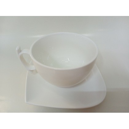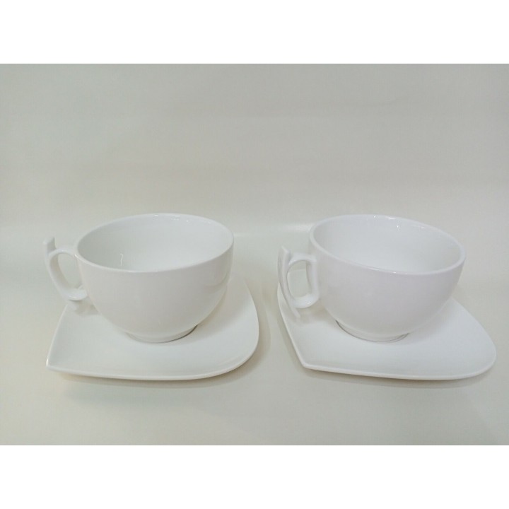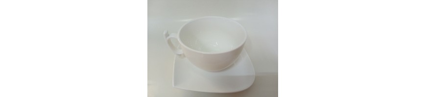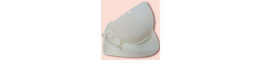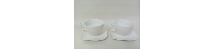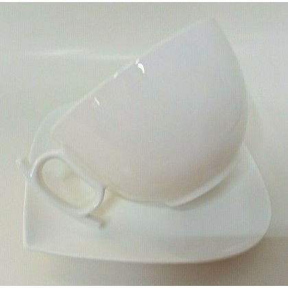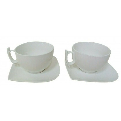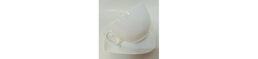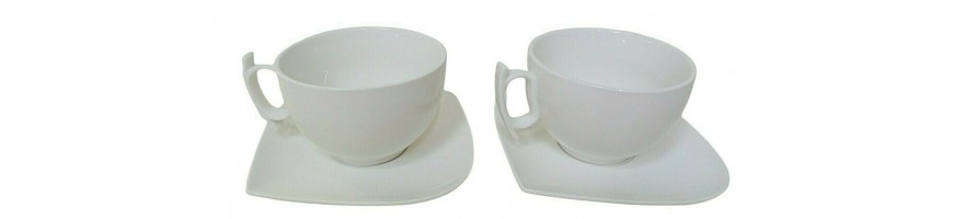 realizzate in porcellana bianca resistente, forma moderna e dinamica con particolari come i manici delle tazze e la piattina forma di foglia adatto a lavaggio in lavastoviglie ed uso in micro onde