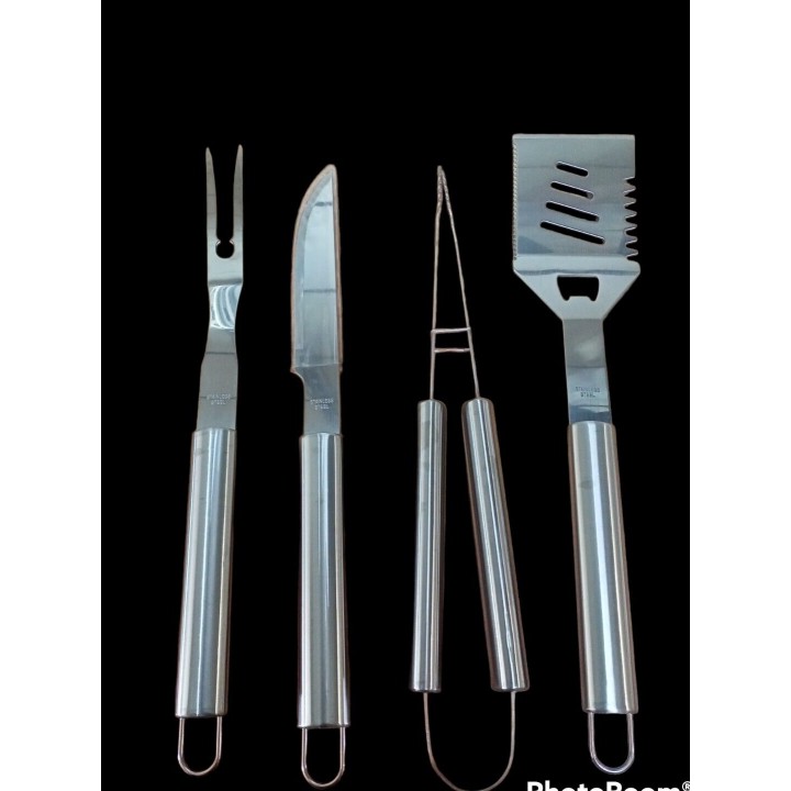 Il set contiene: 1 pinza, 1 coltello, 1 forchettone ed 1 pala multiuso,